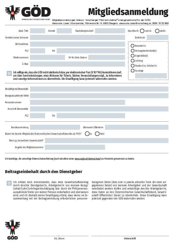 Mit diesem Formular kannst du zur Gewerkschaft Öffentlicher Dienst beitreten. Einfach ausfüllen, erste Seite zweimal unterschreiben, abfotografieren und an folgende Adresse mailen oder per Whatsapp schicken: loseralexandra(at)hotmail(dot)com