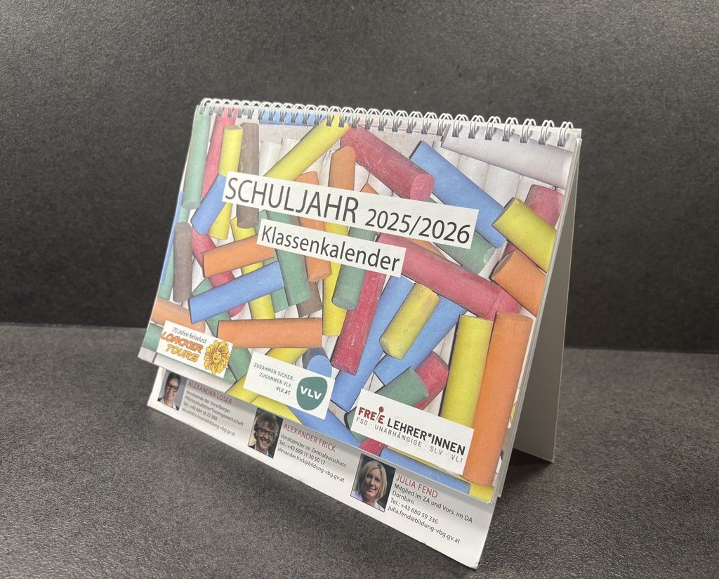 Der Taschenkalender ist unser ältestes Produkt. Er wird zum Schulbeginn an alle Lehrpersonen verteilt. Neben dem Kalendarium findet ihr all unsere PersonalvertreterInnen, Liste zum Eintragen von Supplierstunden, Seite für den Stundenplan, wichtige Adressen und Telefonnummern, Infos über Schulveranstaltungen, Bauschvergütungen, dislozierter Unterricht, Spezialpool und Zeitkonto.